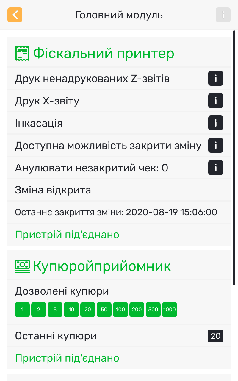 В детальном обзоре главного модуля, администратор 1-го уровня может просмотреть список (который можно скролить), содержащий перечень всех элементов главного модуля, их статусы и выполнить дополнительные сервисные операции. Наличие периферийных (фискальный принтер, купюроприемник, терминал безналичной оплаты) устройств зависит от комплектации автомата.